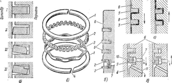 а - поперечные сечения компрессионных колец и их положения в рабочем состоянии; б ~ составное маслосъемное кольцо; в - головка поршня двигателя автомобиля ЗИЛ-130 с поршневыми кольцами; г - схема насосного действия компрессионных колец; д - схема работы маслосъемных колец; / - кольцо прямоугольного сечения; // - кольцо с конической наружной поверхностью; // / - кольцо с фаской на внутренней стороне; IV - кольцо с выточкой на внутренней стороне; / - дискообразные кольца; 2 - осевой расширитель; 3 - радиальный расширитель; 4 - замок кольца; 5 - компрессионные кольца; 6 - поршень; 7 - отверстие в канавке маслосъемного кольца; 8 - цилиндр; 9 - маслосъемное кольцо; 10 - прорези в кольце; 11 - отверстие в поршне; сплошными стрелками показано направление движения поршня, а штриховыми - масла