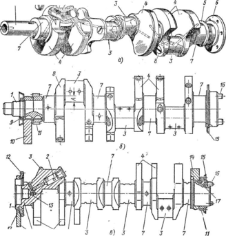 Коленчатый вал (рис.7, а) имеет следующие части: коренные 7 и шатунные 3 шейки, щеки 8, противовесы 4, передний конец 1 и задний конец (хвостовик) с маслоотражателем 5, маслосгонной резьбой и фланцем 6 для крепления маховика. Шатунные шейки служат для соединения коленчатого вала с шатунами. Коренные шейки вала входят в подшипники, установленные в блоке цилиндров. Щеки соединяют коренные и шатунные шейки вала, образуя колена или кривошипы. Противовесы, расположенные на коленчатом валу, разгружают коренные подшипники от сил инерции и создаваемых ими моментов.