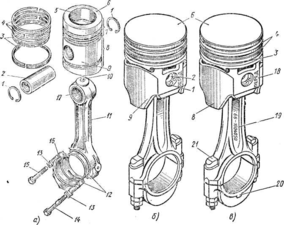 а - дизелей ЯМЗ; б и в - двигателей автомобилей ГАЗ-53А, где даны поршни в сборе с шатуном, устанавливаемые соответственно в первый, второй, третий и четвертый цилиндры левого блока и в пятый, шестой, седьмой к восьмой цилиндры правого блока; 1 - стопорное кольцо; 2 - поршневой палец; 3 - маслосъемные кольца; 4 - компрессионные кольца; 5 - камера сгорания в днище поршня; 6 - днище поршня; 7 - головка поршня; 8 - юбка; 9 - поршень; 10 - распылитель масла (форсунка); 11 - шатун; 12 - вкладыши; 13 - замковая шайба; 14 - длинный болт; 15 - короткий болт; 16 - крышка шатуна; 17 - втулка в головке шатуна; 18 - надпись на поршне; 19 - номер на шатуне; 20 - метка на крышке шатуна; 21 - шатунный болт.