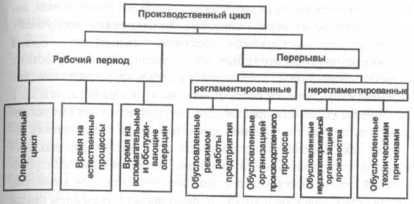 Длительностью производственного цикла называется интервал календарного времени от качала до окончания производственного процесса изготовления (ремонта) одного изделия или партии этих изделий. Производственный цикл имеет сложную структуру. В него включаются рабочий период и перерывы. В свою очередь рабочий период состоит из времени выполнения основных технологических операций с применением оборудования или ручного труда (операционный цикл), времени на естественные процессы, выполнение которых предусмотрено технологическим процессом (старение, сушка, остывание заготовок), времени на выполнение вспомогательных и обслуживающих операций (контрольных, транспортных).