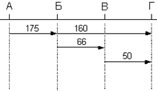 1. Схема железнодорожного направления с четырьмя опорными станциями с указанием вагонопотоков и расчетных параметров.