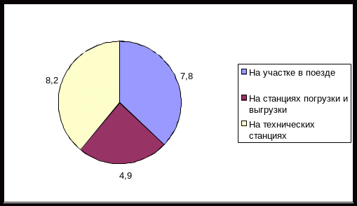 4. Оборот вагона в часах и сутках с выделением доли, приходящейся на время его нахождения на участках в поездах, на станциях погрузки и выгрузки, на технических станциях.