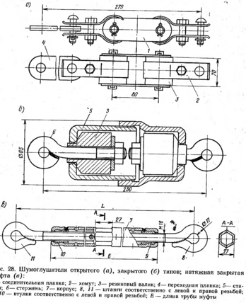Защитой от передачи на стены шума служит шумоглушитель (рис 28, а). Шумоглушитель состоит из двух, соединенных между собой планками резиновых валиков, на которых гасятся звуковые колебания. На валики надеты хомуты, одним из которых шумоглушитель соединяется с тросом, а вторым через переходную планку — с крюком. В другой конструкции резиновые валики заключены в двух свинченных стаканах (рис. 28, б). Здесь более полно используется объем резиновых валиков.
