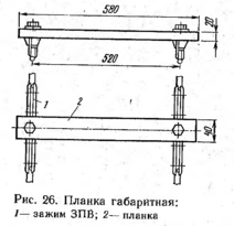 Планка габаритная (рис. 26) предназначена для фиксирования установленного расстояния между проводами троллейбуса. Планку применяют как временную меру против схлестывания проводов в пролете, когда сильно ослаблено натяжение хотя бы одного из них или обоих либо оборвана поперечина и подвеска осталась на двойном пролете и т. д. После устранения причин, вызвавших установку планки, ее следует снять, так как, обладая сосредоточенной массой и неустойчивым положением, планка ухудшает токосъем и сама может быть причиной нового повреждения сети.