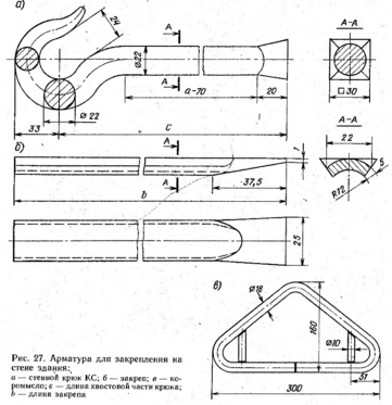 Допускаемая нагрузка на крюк 7 кН. На большие нагрузки, но не превышающие 14 кН, применяют два крюка, связанные коромыслом (рис. 27, в). Для стен с облицовочным слоем толще 200 мм применяют специальные способы закрепления.