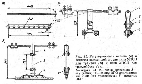 В трамвайных и троллейбусных цепных подвесках и в подвесках полукомпенсированных используют подвесы скользящей струны, перемещающиеся вдоль продольно-несущего троса от температурных изменений длины провода. Трамвайный подвес (рис. 22, б) состоит из серьги и подвесного зажима, соединенных через подвесную вилку. Троллейбусный подвес УПСИ (рис. 22, в) аналогичен трамвайному, но между вилкой и серьгой включается изолятор.