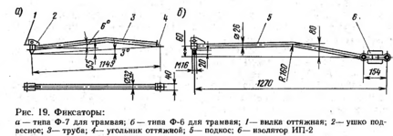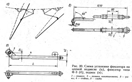 На цепной подвеске для закрепления точек отклонений провода, образующих зигзаг, и на кривых участках применяют фиксаторы Ф-3, устанавливаемые на гибкой поперечине с помощью подкоса (рис. 20). В точке подвешивания несущего троса расстояние от него до контактного провода определяется в зависимости от длины подвешиваемого пролета провода. Фиксатор сохраняет свои размеры для всех случаев подвески. Нужное расстояние получают применением соответствующей длины подкоса для пролетов разной длины.