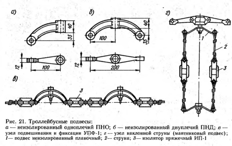 Троллейбусные подвесы изготавливают нескольких видов: подвес неизолированный двуплечий ПНД (рис. 21,6), подвес неизолированный одноплечий ПНО (рис. 21, а) и подвес неизолированный планочный.