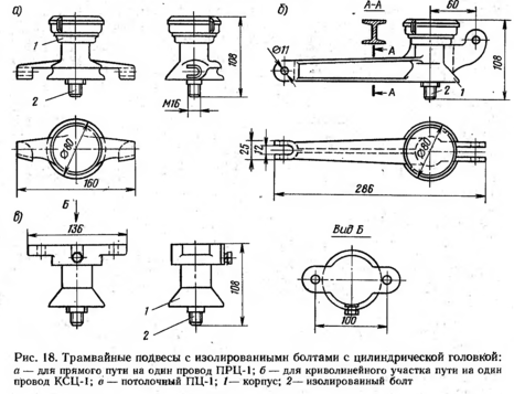 На кривых участках сети применяются подвесы фиксаторного. типа различных конструкций. Контактная вставка токоприемника 38 скользит непосредственно по проводу. На рис. 19, а показан неизолированный подвес-фиксатор типа Ф-7, выполненный из трубы диаметром 32 мм. Подвес( монтируется в рассечку поперечины с установкой натяжных изоляторов по обе стороны. В междупутье можно устанавливать и один изолятор на поперечине. Допускаемая нагрузка 5 кН. Другой вид неизолированного подвеса того же назначения — фиксатор Ф-6— закрепляется на поперечине с помощью бугеля или струнного зажима. В комплект включается натяжной изолятор ИП-1 (рис. 19, б). Допустимая нагрузка 5 кН.