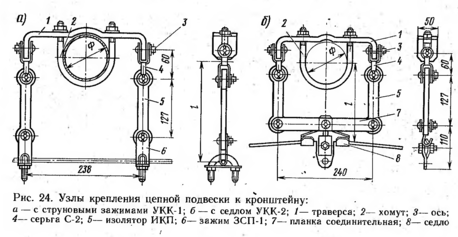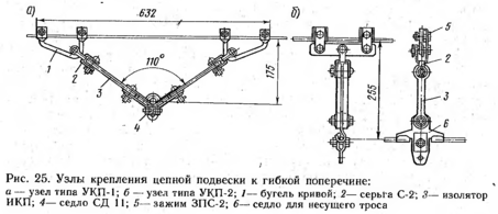 Узлы крепления цепной подвески к гибким поперечинам УКП-1 (рис. 25, а) и УКП-2 (рис. 25, б) представляют различные конструкции' узлов одного, назначения.