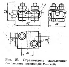 На несущем тросе по обе стороны от подвеса устанавливают ограничители перемещения серьги, выполненные в виде специальных зажимов (рис. 23). Расстояние между ограничителями определяется температурными удлинениями провода. Наименьшее расстояние — между ограничителями на подвесах, соседних со средней анкеровкой, наибольшее — вблизи грузовых компенсаторов.