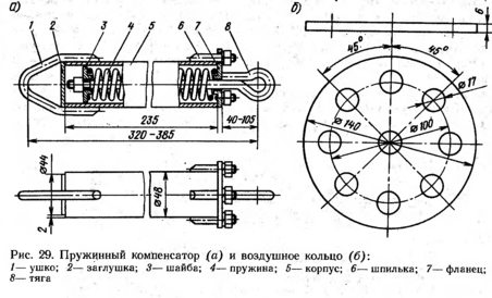 Часть фиксирующей поперечины, находящейся внутри кривого участка пути, может оказаться слабо натянутой и иметь большой провес, мешающий проходу пантографа. Постоянное натяжение этого участка можно получить, включив пружинный компенсатор у точки крепления поперечины. Пружинный компенсатор (рис. 29, а) представляет собой заключенную в стальной корпус пружину, работающую на сжатие. Длина пружины 215 мм, а в сжатом положении 138 мм, ход пружины 77 мм. Расчетное усилие, развиваемое полностью сжатой пружиной, 1650 Н. Наибольшее расчетное рабочее усилие 1300 Н. Пружинные компенсаторы включают и в анкерные тросы при анкеровке кронштейнов для смягчения удара, возникающего при обрыве закрепленных на кронштейне тросов и проводов.