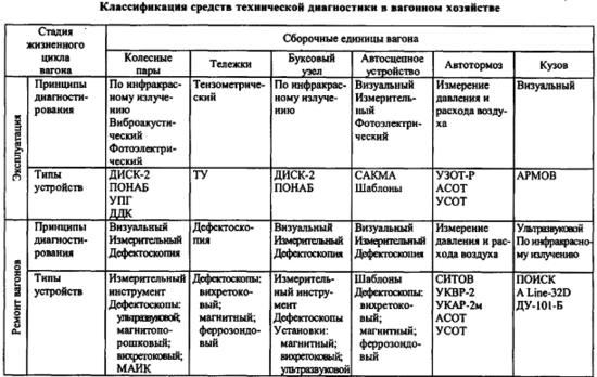 Современные СТД позволяют реализовать вторую тенденцию, при которой, несмотря на усложнение общей схемы диагностирования, можно достигнуть значительного сокращения материальных затрат при высокой достоверности контроля. Основные СТД, применяемые в эксплуатации и при плановых видах ремонта вагонов, представлены в таблице.