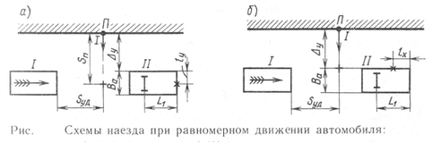 На рис. 1, а показана схема ДТП, в процессе которого автомобиль, двигавшийся с постоянной скоростью, сбил пешехода П своей передней частью. Прямым крестом здесь (и в дальнейшем) обозначено место взаимного контакта автомобиля и пешехода на проезжей части в момент наезда (место наезда). Косым крестом отмечено расположение на автомобиле детали, нанесшей удар пешеходу (место удара). Положение автомобиля и пешехода в момент возникновения опасной обстановки обозначено цифрой /, а положение автомобиля после остановки — цифрой //. Поскольку водитель перед наездом не тормозил, то после остановки автомобиль может занимать на проезжей части любое положение.