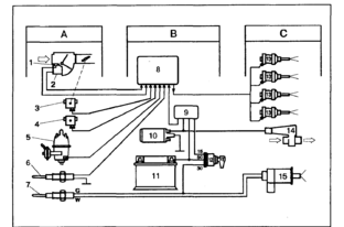 А — устройство входных параметров: 1 — датчик температуры всасываемого воздуха, 2 — расходомер воздуха, 3 — выключатель положения дроссельной заслонки, 4 — высотный корректор, 5 — датчик-распределитель зажигания, б — датчик температуры охлаждающей жидкости, 7 — термореле. В — устройства управления и обеспечения: 8 — электронный блок управления, 9 — блок реле, 10 — топливный насос, 11 — аккумуляторная батарея, 12 — выключатель зажигания. С — устройства выходных параметров: 13 — рабочие форсунки, 14 — клапан добавочного воздуха, 15 — пусковая форсунка