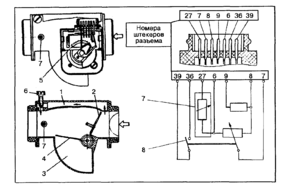 1 — обводной канал, 2 — измерительная заслонка, 3 — демпферная камера, 4 — пластина демпфера, 5 — потенциометр, 6 — винт качества (состава) смеси холостого хода, 7 — датчик температуры, 8 — контакты топливного насоса