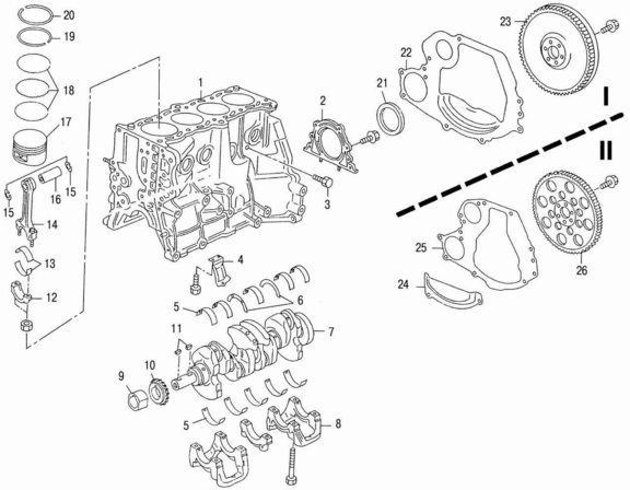 Рис.2. Детали блока цилиндров и кривошипно-шатунного механизма двигателя GA16DE: I — с механической коробкой передач; II — с автоматической коробкой передач;