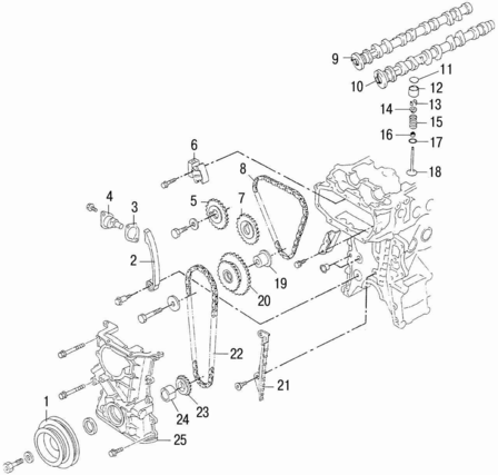 13 — сухари; 14 — тарелка пружины; 15 — пружина; 16 — маслоотражательный колпачок; 17 — опорная шайба пружины; 18 — клапан; 19 — ось промежуточной звездочки; 20 — промежуточная звездочка; 21 — успокоитель; 22 — цель привода промежуточной звездочки; 23 — звездочка коленчатого вала; 24 — втулка привода масляного насоса; 25 — передняя крышка привода распределительных валов