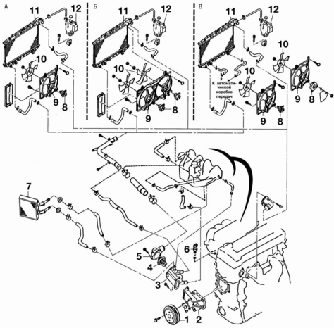 Рис. 5. Детали системы охлаждения: А — автомобили с механической коробкой передач без кондиционера; Б — автомобили с механической коробкой передач с кондиционером; В — автомобили с автоматической коробкой передач; 1 — шкив водяного насоса; 2 — водяной насос; 3 — корпус термостата; 4 — термостат; 5 — крышка термостата; 6 — датчик температуры охлаждающей жидкости; 7 — радиатор отопителя салона; 8 — электродвигатель вентилятора; 9 — кронштейн электровентилятора; 10 — крыльчатка вентилятора; 11 — радиатор системы охлаждения двигателя; 12 — расширительный бачок