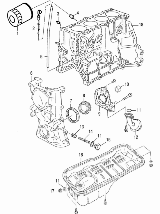 Рис. 4. Детали системы смазки двигателей GA14DE и GA16DE: 1 — масляный фильтр; 2 — щуп для проверки уровня масла; 3 — датчик давления масла; 4 — втулка крепления масляного фильтра; 5 — направляющая трубка щупа для проверки уровня масла; 6 — передняя крышка привода распределительных валов; 7 — ведомая шестерня масляного насоса; 8 — ведущая шестерня масляного насоса; 9 — крышка масляного насоса; 10 — втулка привода масляного насоса; 11 — уплотнительное кольцо; 12 — маслоприемник; 13 — плунжер редукционного клапана; 14 — пружина; 15 — пробка редукционного клапана; 16 — масляный картер; 17 — пробка сливного отверстия; 18 — блок цилиндров