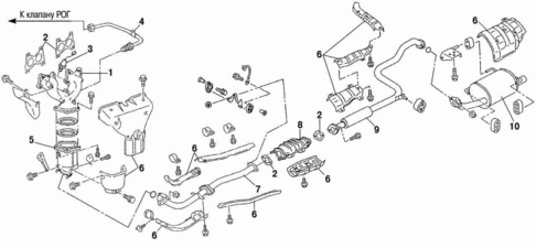 На автомобилях система выпуска отработавших газов состоит из приемной трубы 7 (рис. 7.), двух каталитических нейтрализаторов, переднего и заднего глушителей. Система выпуска закреплена на автомобиле на резиновых подвесках
