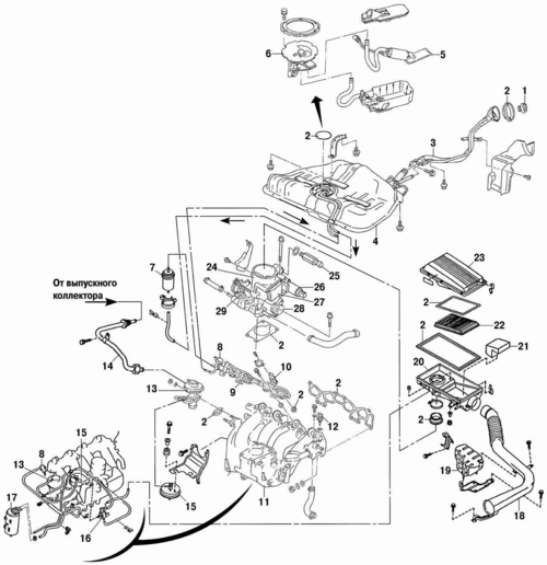Рис. 6. Детали системы питания двигателей GA14DE и GA16DE: 1 — крышка топливного бака; 2 — прокладка; 3 — наливная труба; 4 — топливный бак; 5 — топливный насос; 6 — датчик уровня топлива; 7 — топливный фильтр; 8 — регулятор давления топлива; 9 — рампа; 10 — топливная форсунка; 11 — впускной трубопровод; 12 — датчик температуры охлаждающей жидкости; 13 — клапан РОГ; 14 — трубопровод РОГ; 15 — датчик дифференциального давления; 16 — электромагнитный клапан системы РОГ; 17 — абсорбер; 18 — шланг воздухозаборника; 19 — глушитель шума впуска; 20 — корпус воздушного фильтра; 21 — сепаратор паров масла; 22 — воздушный фильтр; 23 — крышка воздушного фильтра; 24 — корпус дроссельной заслонки; 25 — регулятор ускоренного холостого хода; 26 — регулятор холостого хода; 27 — измеритель массового расхода воздуха; 28 — датчик положения дроссельной заслонки; 29 — привод терморегулятора повышенных оборотов