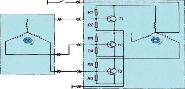 Імпульси напруги від кожної обмотки датчика подаються по проводах на бази транзисторів Т1, Т2, Т3 (КТ801А). У результаті транзистори працюють у ключовому режимі, подаючи через вимикач запалювання живлення в статорні обмотки електродвигуна приймача (покажчика). Резистори R1 – R6 служать для поліпшення умов перемикання транзисторів. При вимиканні чергового транзистора напруга бортової мережі подається до відповідної обмотки статора електродвигуна. У результаті створюється обертове магнітне поле, що приводить в обертання ротор (постійний магніт) електродвигуна, на валу якого закріплений постійний магніт швидкісного вузла. Через черв'ячну передачу приводиться в дію лічильний вузол. Покажчик датчик