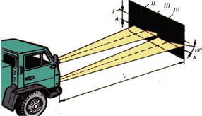 Автомобіль установіть так, щоб його подовжня вісь була перпендикулярною до екрана, а лінія III збіглася з подовжньою площиною симетрії автомобіля. Допустиме відхилення подовжньої симетрії щодо лінії III, не більше ±5 см. Лінії II і IV повинні збігатися з проекцією центрів фар автомобіля на площину екрана. Лінія І повинна знаходитися на рівні висоти центра фар