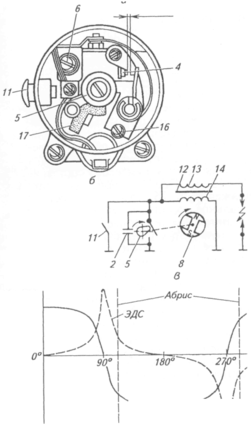 Рисунок 3. Схема магнето М-24: а – общий вид; б – прерыватель; в – электрическая схема; г – график изменения магнитного потока; 1 – корпус; 2 – конденсатор; 3 – контакт первичной обмотки; 4 – контакты; 5 – кулачок; 6 – регулировочный винт; 7 – подшипник; 8 – ротор; 9 – ярмо; 10 – кронштейн крепления; 11 – кнопка выключения; 12 – сердечник; 13 – вторичная обмотка; 14 – первичная обмотка; 15 – разрядник; 16 – стопорный винт; 17 – фильц.
