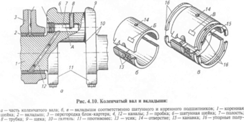 В шатунных шейках высверлена полость 7, которая работает как ступень центробежной очистки масла. Наличие полости уменьшает массу вала. Внутри полости осаждаются механические примеси.