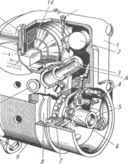 Генератор переменного тока состоит из постоянного двухполюсного магнита-ротора и первичной обмотки трансформатора. Ротор установлен на валу, соединенном с валом двигателя. При вращении магнита через стойки корпуса на сердечник передается переменное магнитное поле. Его силовые линии пересекают витки обмоток и наводят в первичной переменную ЭДС напряжением 30...40 В.