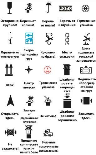 Манипуляционные знаки содержат информацию о способах обращения с грузом (верх не кантовать, осторожно хрупкое, боится сырости и др.)