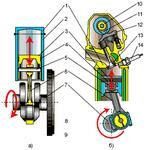 1 - головка цилиндра; 2 - цилиндр; 3 - поршень; 4 - поршневые кольца; 5 - поршневой палец; 6 - шатун; 7 - коленчатый вал; 8 - маховик; 9 - кривошип; 10 - распределительный вал; 11 - кулачок распределительного вала; 12 - рычаг; 13 - клапан; 14 - свеча зажигания