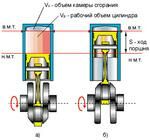 Рисунок 8. - Ход поршня и объемы цилиндра двигателя а) поршень в нижней мертвой точке б) поршень в верхней мертвой точке