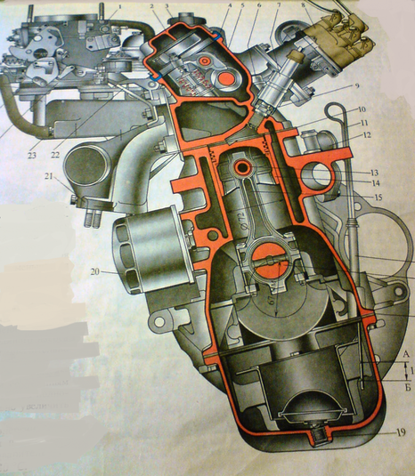 1— карбюратор; 2 — крышка головки цилиндров; 3 — крышка маслозаливной горловины; 4 — прокладка крышки головки цилиндров; 5 — головка цилиндров; 6 — болт крепления головки цилиндров; 7 — наконечник свечи; 6 — датчик - распределитель; 9 — свеча зажигания; 10 — прокладка головки цилиндров; 11 — масло измерительный стержень; 12 — перепускная труба; 13 — поршневой палец; 14 — поршень; 15 — шатун; 16 — трубка маслоизмерительного стержня; 17 — коленчатый вал; 18 — прокладка масляного картера; 19 — маслосливная пробка; 20 — масляный фильтр; 21 — выпускной коллектор; 22 — рым-планка; 23 — впускной коллектор; 24 — проставка фланца карбюратора; 25 — топливосборник; 26 — прокладки фланца карбюратора. Уровни масла: А — верхний, равный объему масла в 3,45 л и Б — нижний, равный объему масла.