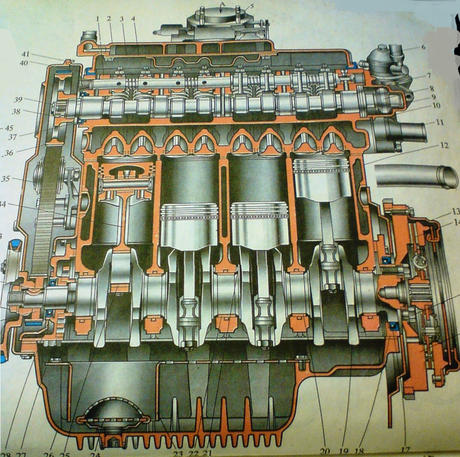 1 – головка цилиндров, 2 — крышка головки цилиндров; 3 и 4 соответственно прокладка и крышке маслоотделителя; 7 — фланец карбюратора для крепления воздушного фильтра; 6 — топливный насос, 7 - распределительный вал; 8 - ведущая шестерня привода датчика - распределителя; 9 — кулачок привода топливного насоса; 10 - корпус привода датчика - распределителя и топливного насоса; 11 — отводящий патрубок; 12 - блок цилиндров; 13 — нажимной диск сцепления; 14 — ведомый диск сцепления; 15 и 39 — болты; 16 - маховик; 17, 28 и 37 — манжеты; 18 — держатель манжеты; 19 — коленчатый вал; 20 — вкладыши коренных подшипников коленчатого вала; 21 - упорные полукольца подшипника коленчатого вала; 22 - вкладыш среднего коренного подшипника коленчатого вала; 23 — масло-успокоитель; 24 - приемник масляного насоса; 25 — вкладыш нижней головки шатуна; 26 — масляный картер; 27 — масляный насос; 29 — шкив привода генератора; 30 — ведущий шкив коленчатого вала; 31 — гайка крепления шкива; 32 — шпонка; 33 — плоскозубчатый ремень; 34 — шатун с поршнем, поршневыми кольцами и пальцем; 35 — натяжной ролик; 36 — шкив привода распределительного вала; 38 — стопорная шайба шкива; 40 и 41 — соответственно внутренний и наружный кожухи плоскозубчатого ремня.