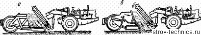 Технологические схемы работы. Для разработки грунта заранее составляют схему, по которой будет работать скрепер. Производительность скрепера зависит от того, насколько полно используется емкость ковша и рационально выбирается схема резания и набора грунта. Рекомендуется набирать грунт на передаче базовой машины при скорости 2—3 км/ч, при толщине срезаемой стружки от 7 до 35 см, что в свою очередь определяется категорией грунта и мощностью базового тягача и толкача. Трактор-толкач обеспечивает полную загрузку ковша скрепера в плотных грунтах. Наполнение ковша с постепенным выглублением ножа производят при постоянной толщине стружки и ширине резания. Этот способ используют при планировке грунта. Для сокращения времени набора грунта используют ступенчатый способ наполнения ковша. Зарезание грунта при устройстве выемок и разработке резервов ведут по ребристо-шахматной схеме, по которой разработка грунта ведется последовательными рядами проходок, одинаковыми по длине и расположению. При работе скрепера по этой схеме между проходами первого ряда оставляют полосы неразработанного грунта шириной не более 1, 3 м. Второй ряд разработок ведется на расстоянии половины длины проходки от первого и расположен по оси оставленных полос грунта. Работа по этой схеме увеличивает заполнение ковша до 110% его геометрической емкости, сокращая при этом на 10—15% путь и время набора грунта. По этой схеме скрепер может работать без трактора-толкача. При работе в рыхлых сыпучих грунтах применяют способ, называемый «клевок». По этому способу величина заглубления ковша в 2 раза больше той, которая соответствует устойчивой работе двигателя с полной нагрузкой. При работе базового тягача на неустойчивой характеристике двигателя ковш выглубляется, в это время двигатель снова набирает нужные обороты, и так повторяется до тех пор, пока ковш будет полным.
