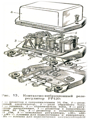 На рис. 13 показана конструкция, а на рис. 14 электрическая схема трёхэлементного реле-регулятора РР130. На полумонтажной схеме (рис. 14, а) указаны не только электрические цепи, но и контуры магнитных систем отдельных реле. Это облегчает изучение реальных электрических цепей в реле-регуляторе. На развёрнутой схеме (рис. 14, б) легче проследить пути тока, проанализировать работу отдельных элементов схемы (приборов) и найти их возможные неисправности.