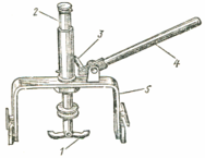 1-губки, 2 шток, 3-собачка, 4-рукоятка, 5-скоба. штыря аккумулятора.