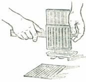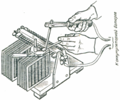 Для извлечения пластин из бака применяют специальный захват (рис. 8), губки которого плотно зажимают свободные концы выводных штырей. После извлечения пластины устанавливают на 2–3 мин на крае бака для стекания электролита, а затем промывают в дистиллированной воде. Сепараторы удаляют (рис. 9) тонкой пластиной из органического стекла или пластмассы, а поверхность пластин очищают от остатков разрушившихся сепараторов. Негодные пластины заменяют другими. При замене 1–2 пластин рекомендуется ставить бывшие в употреблении пластины. При замене большего количества пластин необходимо заменить весь блок пластин исправным, взяв его из разобранной ранее, бывшей в употреблении батареи того же типа.