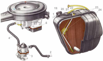 Устройство системы питания. Топливный бак 24 сварен из двух половин из стального листа, с внутренней стороны освинцован. Снаружи бак окрашен черной эмалью. Вместимость топливного бака 39 л, включая резерв 4-6,5 л. Когда в баке остается только резерв топлива, на щитке приборов загорается контрольная лампочка резерва.