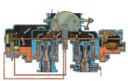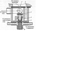 Дозирующе-экономайзерное устройство. Дозирование газа осуществляется в дозирующе-экономайзерном устройстве. Оно позволяет регулировать качество горючей смеси в соответствии с режимами работы двигателя. Подача газа регулируется таким образом, чтобы на частичных нагрузках двигатель работал на обедненных смесях, позволяющих получить наилучшую экономичность и минимальную токсичность отработавших газов. При полном открытии дроссельных заслонок (в режиме максимальной мощности двигателя) горючая смесь при помощи экономайзерного устройства обогащается.