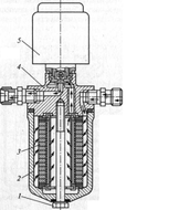 1 - стяжной болт; 2 - стакан; 3 - фильтрующий элемент; 4 - корпус; 5 - электромагнитный клапан.