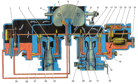 1 - ускорительный насос; 2 - главный воздушный жиклер вторичной камеры; 3 - малый диффузор вторичной камеры; 4 - балансировочный канал; 5 - распылитель экономайзера; 6 - воздушная заслонка; 7 - распылитель ускорительного насоса; 8 - нагнетательный (выпускной) клапан; 9 - кулисный механизм воздушной заслонки; 10 - воздушный жиклер холостого хода; 11 - малый диффузор первичной камеры; 12 - главный воздушный жиклер первичной камеры; 13 - топливный клапан; 14 - топливный фильтр; 15 - поплавок; 16 - смотровое окно; 17 - сливная пробка; 18 - главный топливный жиклер первичной камеры; 19 - эмульсионная трубка первичной камеры; 20 - рычаг привода дроссельных заслонок; 21 - дроссельная заслонка первичной камеры; 22 - переходное отверстие холостого хода; 23 - винт регулировки качества смеси; 24 - топливный жиклер холостого хода 25 - дроссельная заслонка вторичной камеры; 26 - большой диффузор; 27 - эмульсионная трубка вторичной камеры; 28 - главный топливный жиклер вторичной камеры; 29 - обратный (впускной) клапан.
