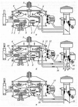 а - при неработающем двигателе; б - при нагрузочном режиме двигателя; в - на холостом ходу; 1, 5, 6 - пружины; 2 - мембрана первой ступени; 3 - клапан первой ступени; 4 - мембрана второй ступени; 7 - двуплечий рычаг второй ступени; 8 - клапан второй ступени; 9 - двуплечий рычаг первой ступени; 10 - предохранительный клапан; 11 - разгрузочное устройство; 12 - дозирующее устройство; 13, 16, 18 - соединительные газовые трубки; 14 - карбюратор-смеситель; 15 - впускной газопровод; 17 - обратный клапан.