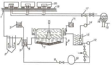 1 – прирельсовый сборный лоток; 2 – колодец – предотстойник; 3 – дозатор коагулянта; 4 – отводящий лоток; 5 – гидроэлеватор; 6 – промежуточный резервуар; 7 – флотатор-отстойник; 8 – рециркуляционный трубопровод; 9 – выпуск нефтепродуктов; 10 – напорный бак; 11 – воздушный эжектор; 12 – рециркуляционный насос; 13 – резервуар для очищенной воды; 14 – насос для подачи воды на промывку; 15 – выпуск в канализацию; 16 – фильтр для доочистки сбрасываемой воды; 17 – водопровод; 18 – хлоратор; 19 – решетка; 20 – промываемые вагоны.