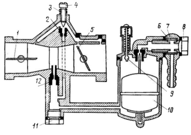 Карбюратор К16-А. Такой карбюратор устанавливают на пусковые двигатели ПД-10У для дизелей тракторов, экскаваторов и других машин. Он имеет две дозирующие системы: холостого хода и главную (рисунок 2). Топливный жиклер холостого хода 2 соединен с колодцем, на выходе из которого с одной стороны расположен жиклер главной системы 12, а с другой – пробка 11. Сечение жиклера 2 можно регулировать винтом 4 со стопорной пружиной 3. Эмульсирующий воздух поступает в систему холостого хода по специальному каналу.