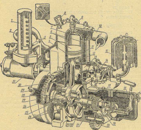 / — глушитель; 2 — выпускная труба; 3 — выпускной патрубок; 4— цилиндр; 5—поршень; б — полости рубашек водяного охлаждения; 7 — головка цилиндров; 8 — краник; 9— свеча зажигания; 10— водоотводящий патрубок; 11 — компрессионное кольцо; 12 — поршневой палец; /3 —впускной канал; 14 — карбюратор; 15 — воздухоочиститель; 16 — продувочный канал; 17 — шестерня коленчатого вала; 18 — регулятор; /0 — шестерня привода регулятора; 20 — промежуточная шестерня; 21 — картер; 22 — передняя цапфа коленчатого вала; 23 — палец кривошипа; 24 — щеки кривошипа; 25 — роликовый подшипник: 26 — шатун; 27 — задняя цапфа коленчатого вала; 28 — маховик с зубчатым венцом; 29— канавка для наматывания пускового шнура; 30 — водоподводящий патрубок; 31 — стартер.