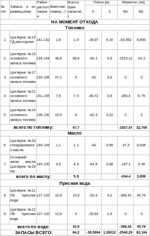Запасы топлива размещаем в первую очередь в расходных цистернах, расположенных в районе машинно-котельного отделения (МКО), танках двойного дна и в последнюю очередь в топливно-балластных танках. Танки, как правило, заполняем полностью, чтобы исключить влияние свободной поверхности жидких грузов на остойчивость. Цистерны пресной воды заполняем полностью.