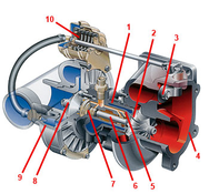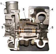 Включает в себя основные части: корпус компрессора 1, компрессорное колесо 2, вал ротора 3, корпус турбины 4, турбинное колесо 5 и корпус подшипников с ротором в сборе.